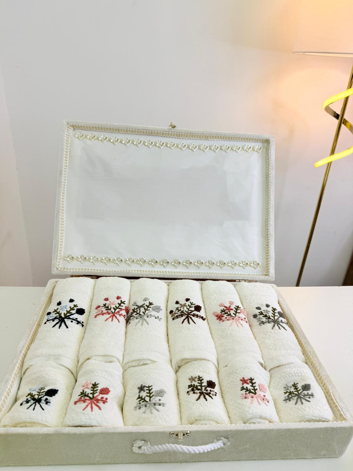 طقم 12 قطعه مناشف وبشاكير بصندوق خشب تطريز ، قطن ، 100%